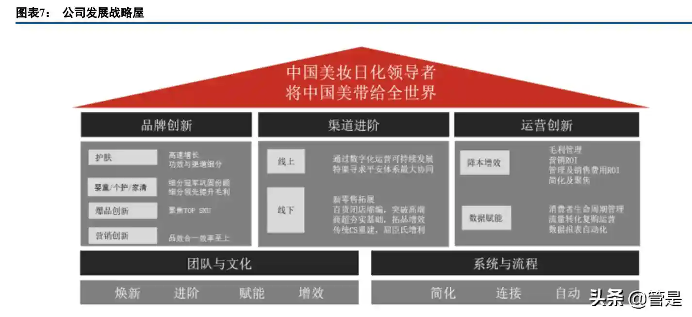 (2020至今):2020年潘秋生上任后提出1个中心、2个基本点、3个助推器的策略框架,2020年公司疫情下实现收入70.32亿元,下滑7.43%,扣非净利润3.96亿元,同比增长4.3%,费用率有所改善。玉泽、家安、双妹等实现高速增长,同时连续下降多年的佰草集、美加净和高夫品牌呈现出改善态势,市场对新任领导上任后的改善预期较佳,后续值得期待。