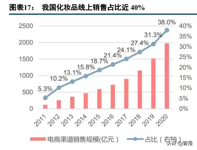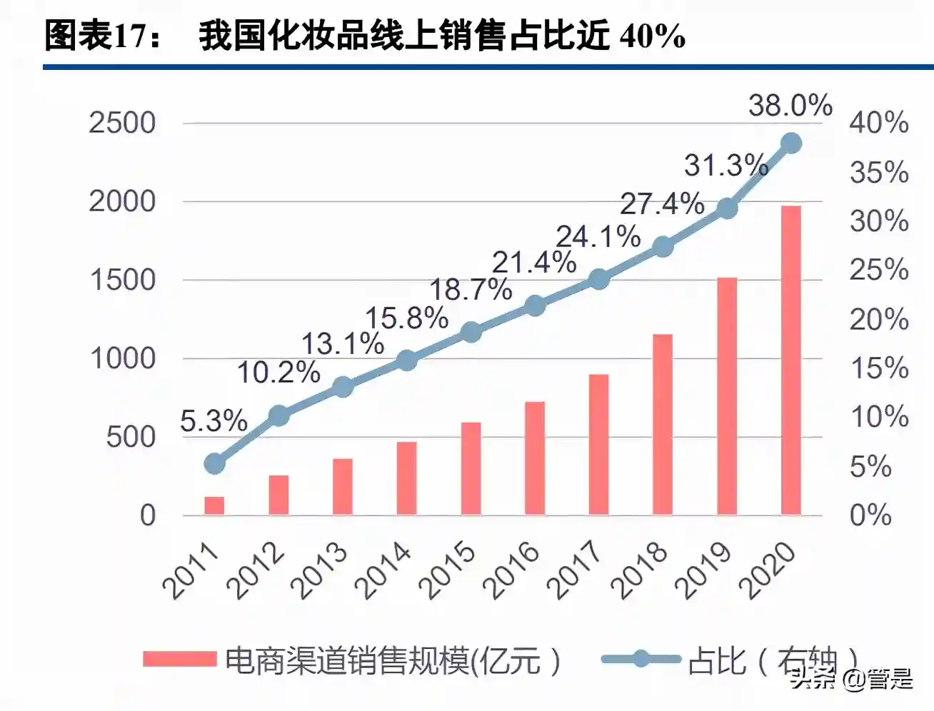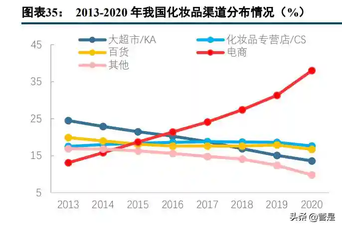 国产品牌在护肤品类的崛起与渠道兴衰密不可分,因为疫情影响,线下零售业态遭受经营的不确定性已经连续两年。目前国内化妆品渠道呈现百货和商超份额被吞噬,化妆品专营店份额相对平稳,线上爆发增长的局面。电商对于商超、百货渠道的替代效应显著,电商渗透率已经达到38%。而海外品牌过去伴随着百货渠道崛起跑马圈地,但在电商渠道并没有比国产品牌更多的既存优势,布局偏保守。我们看到电商渠道的销售入场门槛低,再加新品类产品推陈出新、网红、小红书社交裂变等新营销模式的存在,给予了国产品牌快速成长的机会。