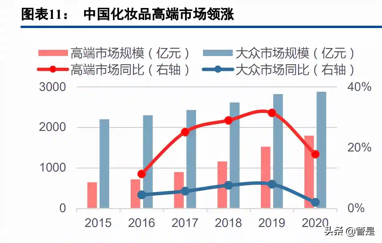 高端市场持续攀升是我国化妆品产业发展的主动力,护肤品为化妆品第一大市场。(1)高端化妆品市场增速高于大众化妆品市场。根据Euromonitor数据,2015-2020年国内高端化妆品市场规模由646.5亿元增至1798.7亿元,CAGR高达23%;大众市场规模由2198.8亿元增至2878.1亿元,CAGR为6%。(2)护肤品和彩妆为行业主要增长动力。从品类上看,基本各个化妆品细分领域2020年销售规模增速均有不同程度提升,但主要增长动力来自占比靠前的护肤品和彩妆。2020年护肤品规模占整体51.9%,系化妆品第一大市场。根据Euromonitor数据统计,2011-2020年中国护肤品市场规模由1152亿元增至2700.8亿元,CAGR为9.9%,为化妆品行业绝对主力。