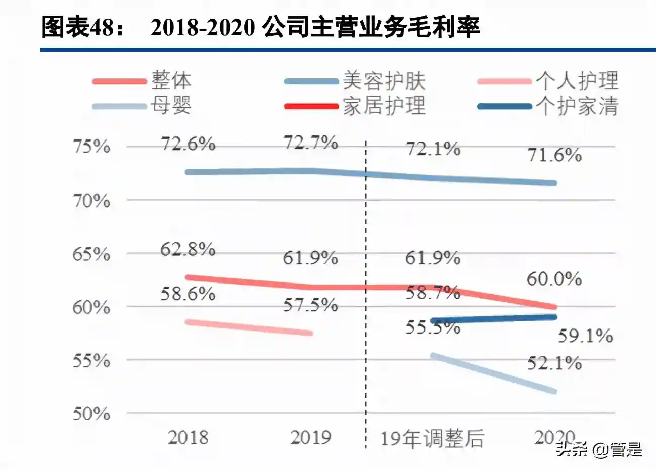 护肤业务毛利率70%以上,汤美星毛利率相对较低。近五年,公司整体毛利率波动在60%至65%之间,整体呈下滑趋势,其中美容护肤产品线的毛利率下降明显。2017年,公司终止毛利率较低的花王产品代理业务,毛利率小幅拉升至64.9%。由于原材料涨价、低毛利产品销售占比提高等因素导致公司2018年毛利率有所下降。2018年之后,因新冠疫情影响及经营策略调整使得毛利率较高的佰草集与高夫收入增长放缓,占比下降影响毛利,单品毛利仍保持稳定。