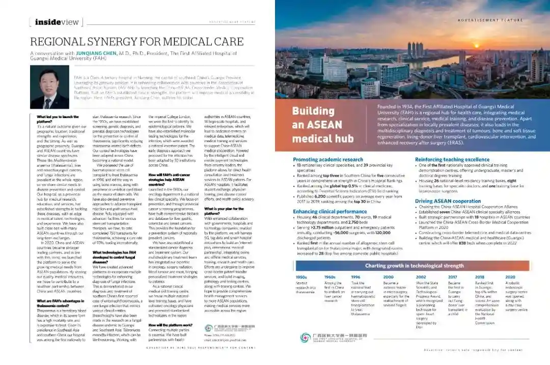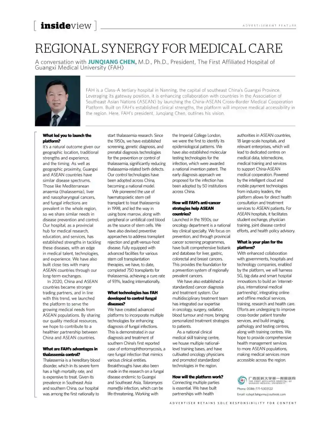 近日,国际领先科学周刊《Nature》在上海专访广西医科大学第一附属医院院长陈俊强,就跨境医疗合作平台、医院地中海贫血的防治研究、真菌病防控、肿瘤一体化防治等方面进行了详谈。