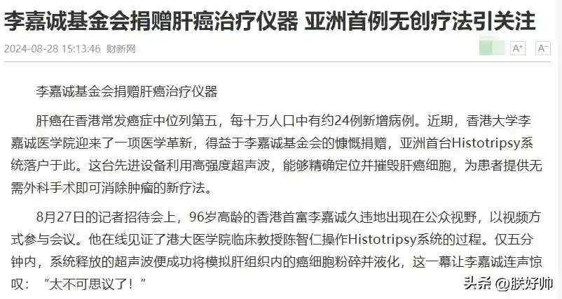 ,是香港大学李嘉诚医学院的一场捐赠仪式,镜头前,李嘉诚先生身着笔挺西装,精神矍铄,脸上带着慈祥的笑容,丝毫看不出已近百岁高龄,他亲切地与医学院的教授、医生们握手交谈,言语间满是期许和鼓励,这一次,他带来的不仅是巨额捐款,更是一份沉甸甸的希望——一台据说能够“攻克癌症”的最新型医疗设备“这真是个不可思议的发明!”在观看设备演示时,李嘉诚先生不禁发出这样的感叹,他专注地聆听着研究人员的讲解,时而点头,时而追问细节,眼中闪烁着兴奋的光芒,仿佛看到了人类战胜病魔的曙光,据悉,这台设备运用了目前世界上最先进的医疗科技,能够精准地识别和消灭癌细胞,同时最大程度地减少对正常组织的损伤,为癌症患者带来新的希望