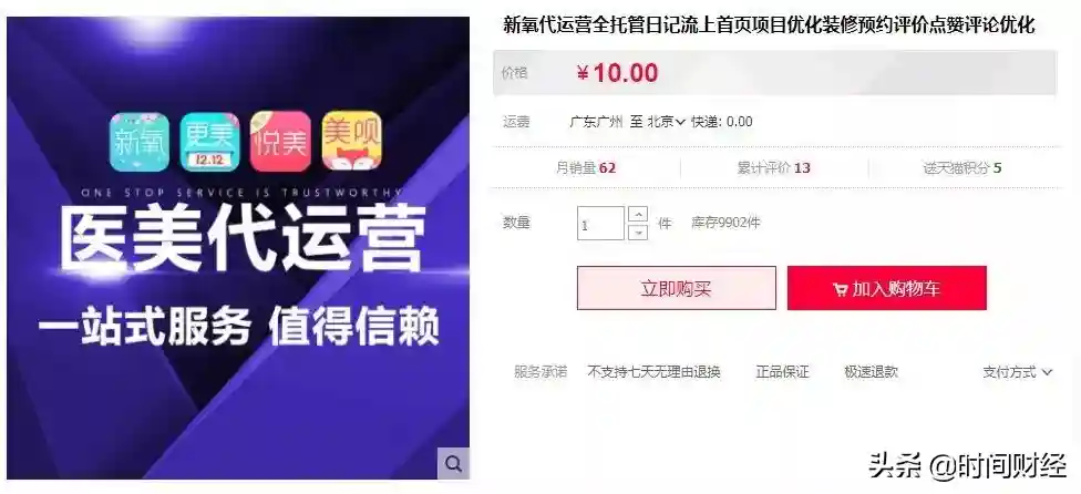“我们是按月收费,新氧每月1.5万,一年18万。如果年签,可以优惠。我们负责整体的运营,包含医生包装、项目包装、文案撰写、案例更新等,每天更新两条案例,也就是一个月60条”,淘宝一家医美代运营商户对时间财经表示。